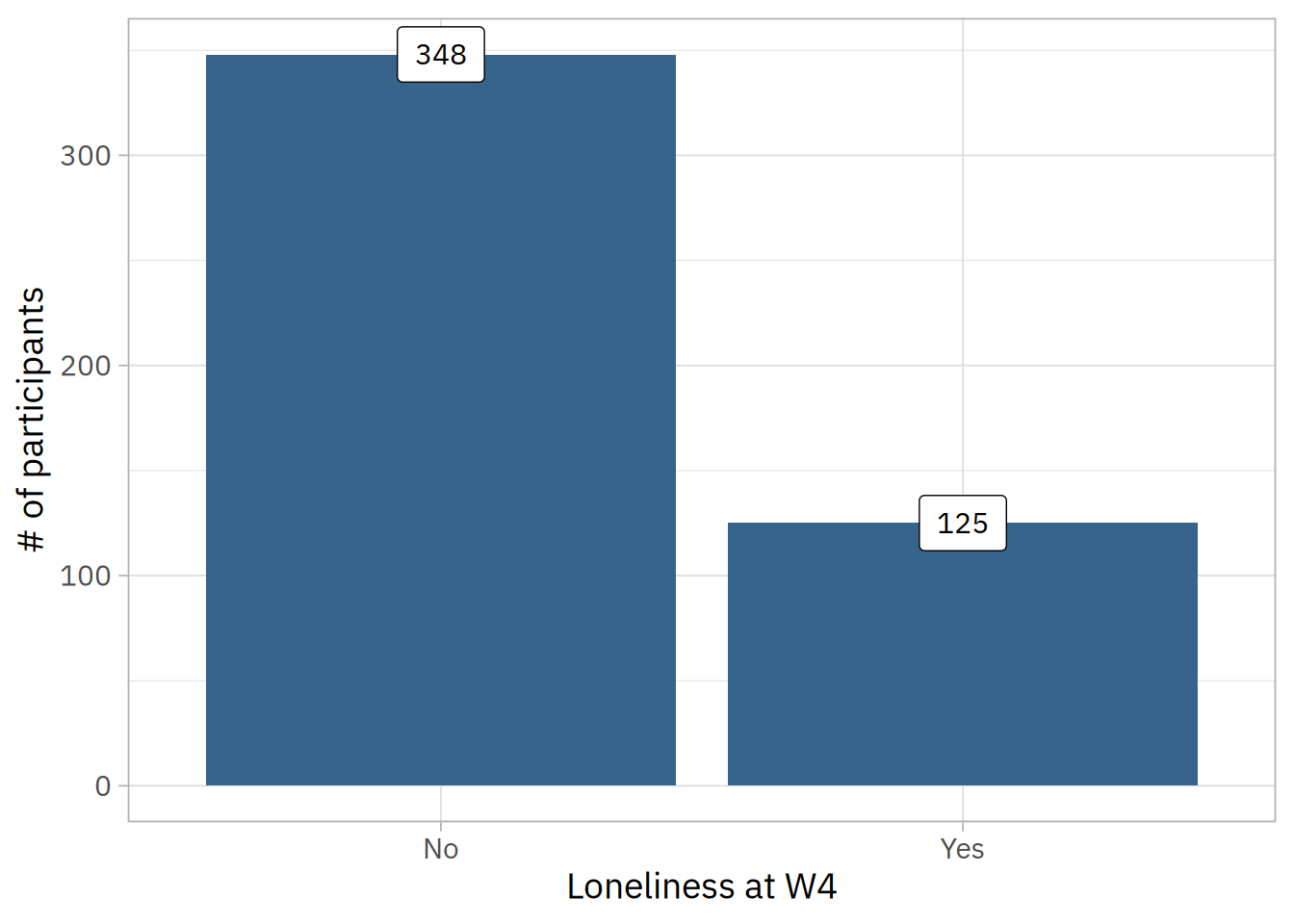 After removing the subjects with loneliness (UCLA \(\geq\) 6) at baseline (W1), there were 473 participants remaining.