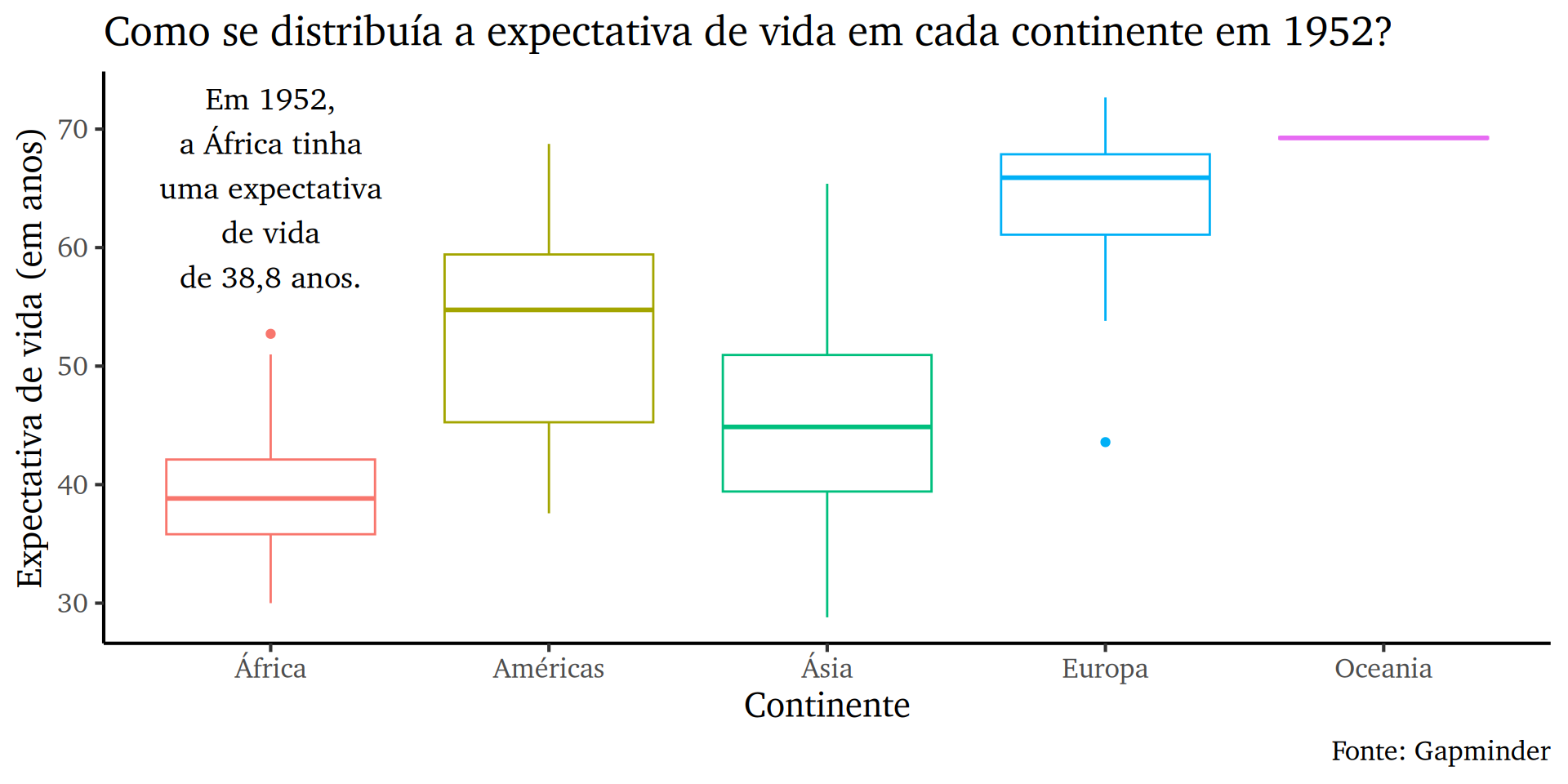 dados_gapminder |>filter(ano ==1952) |>ggplot() +aes(x = continente, y = expectativa_de_vida, color = continente) +geom_boxplot(show.legend =FALSE) +theme_classic(base_size =16, base_family ="Charter") +labs(x ="Continente", y ="Expectativa de vida (em anos)",title ="Como se distribuía a expectativa de vida em cada continente em 1952?",caption ="Fonte: Gapminder") +annotate("text", x =1, y =65,label ="Em 1952,\na África tinha\numa expectativa\nde vida\nde 38,8 anos.",size =5,family ="Charter")