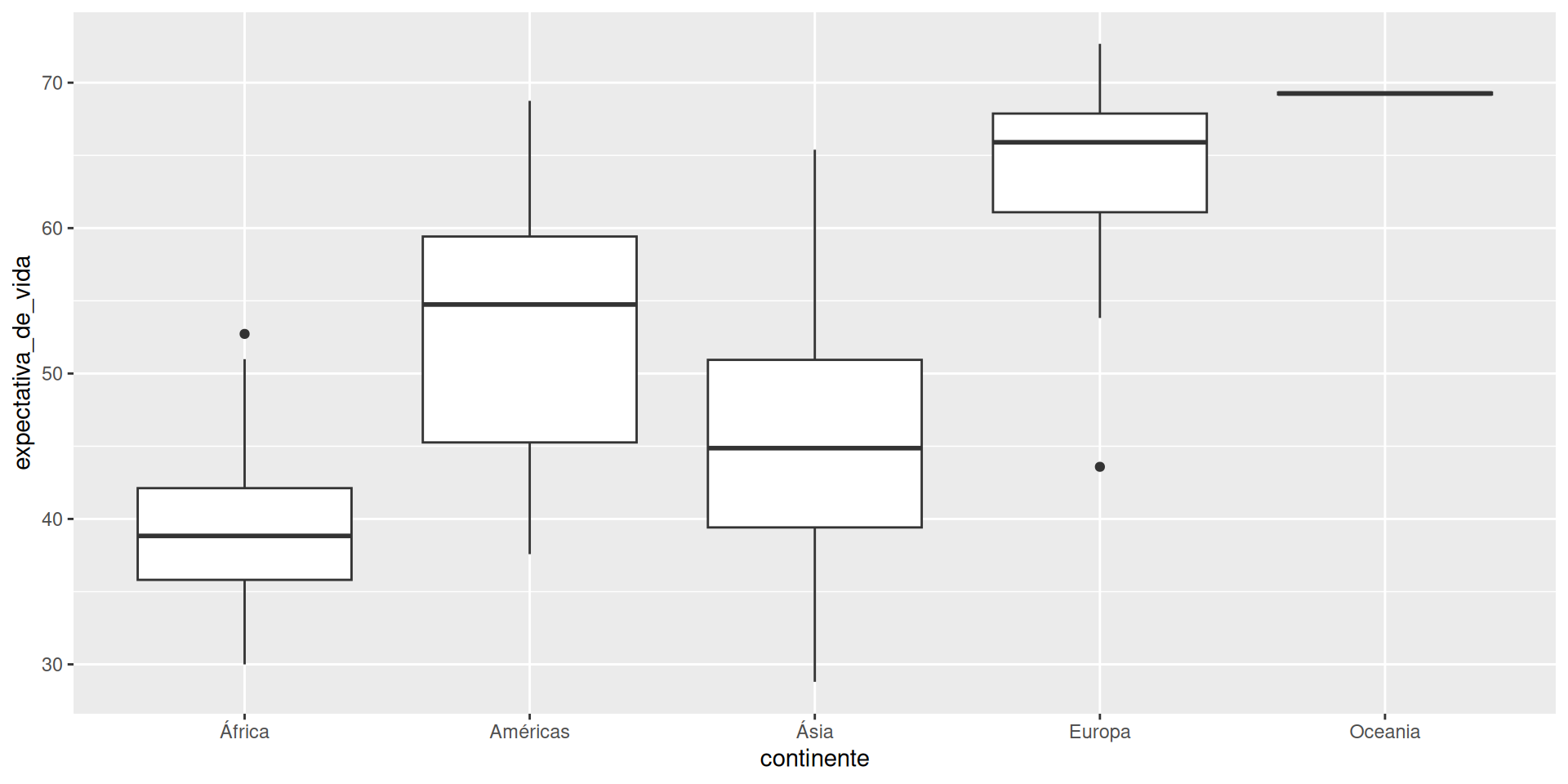 Para construir um box plot, usamos o geom_boxplot(). Para tal, usamos atributos \(x\) e \(y\), mapeando uma variável categórica para o atributo \(x\).
