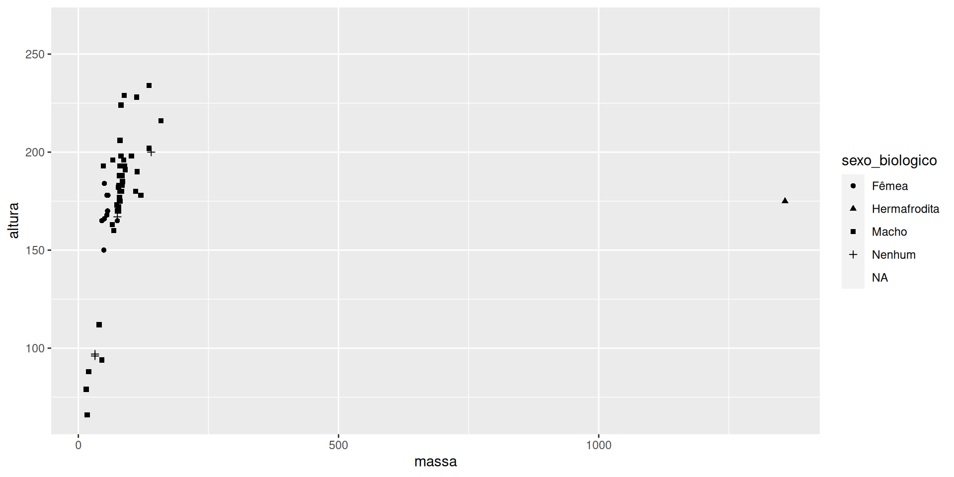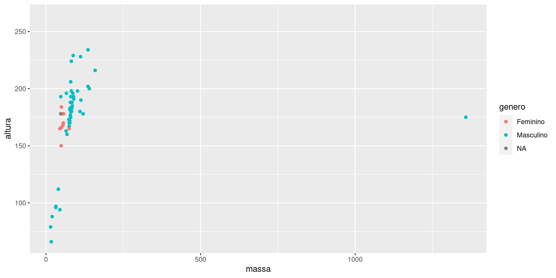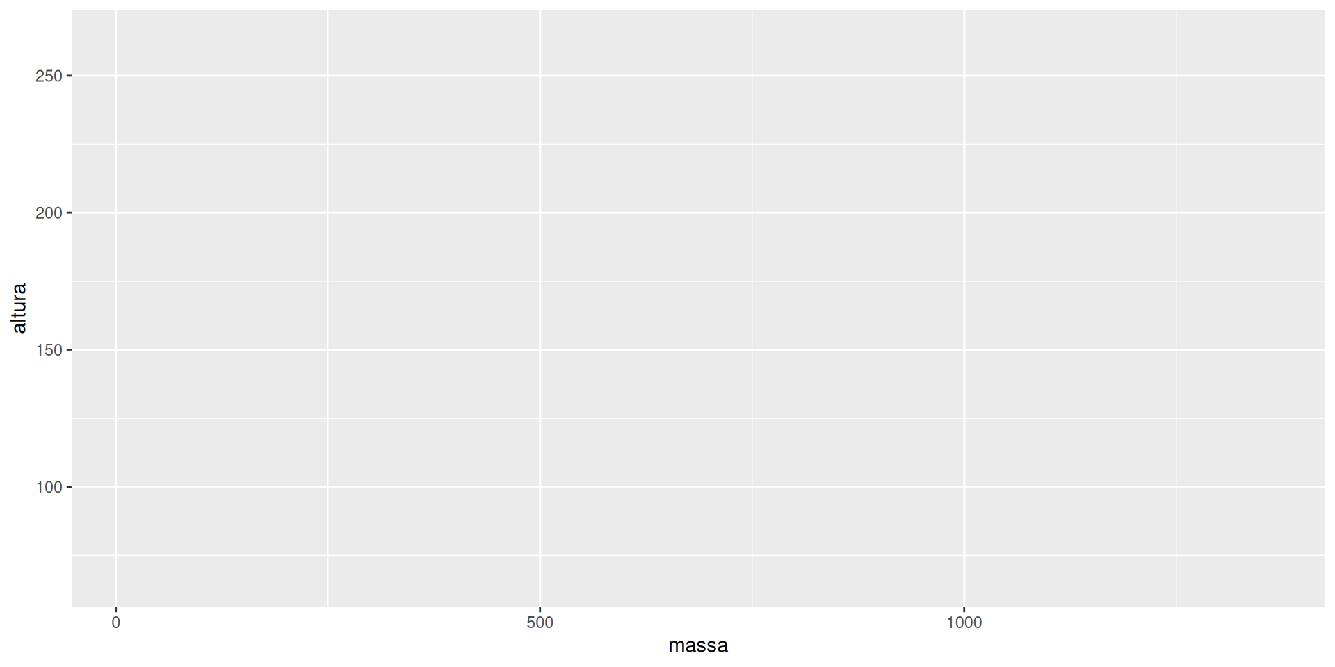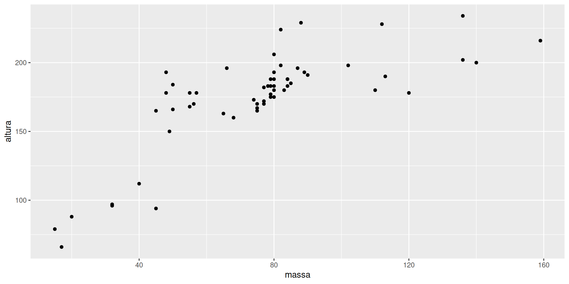 library(ggplot2)dados_starwars |>ggplot() +aes(x = massa, y = altura) +geom_point(color ="forestgreen", size =3) +xlab("Massa (kg)") +ylab("Altura (cm)") +ggtitle("Altura e massa dos personagens") +theme_bw(base_size =18)