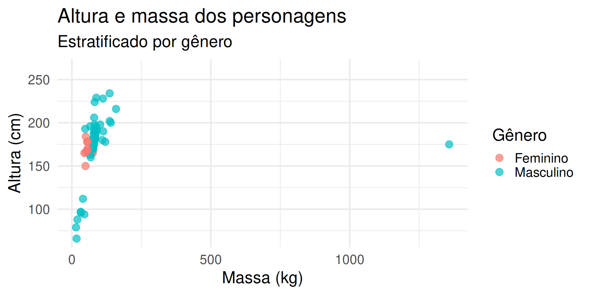 dados_starwars |>filter(!is.na(genero)) |>ggplot() +aes(x = massa, y = altura, color = genero) +geom_point(size =4, alpha =0.7) +xlab("Massa (kg)") +ylab("Altura (cm)") +ggtitle("Altura e massa dos personagens","Estratificado por gênero") +theme_minimal(base_size =20) +scale_color_discrete(name ="Gênero")