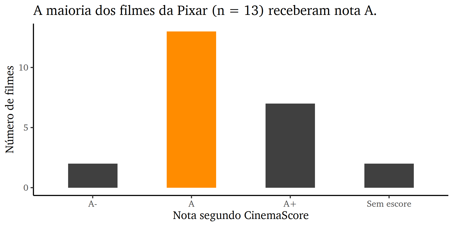 # O código abaixo gera o gráfico do painel ao ladopixar_avalicao_publico |>rename(nota = nota_cinema_score) |>count(nota) |>mutate(nota = forcats::fct_na_value_to_level(nota,"Sem escore"),nota =factor(nota,levels =c("A-", "A","A+","Sem escore")),cor = dplyr::case_when(nota =="A"~"Colorido",.default ="Cinza") ) |>ggplot() +aes(x = nota, y = n, fill = cor) +geom_col(width =0.5, show.legend =FALSE) +scale_fill_manual(values =c("gray25", "darkorange")) +labs(title ="A maioria dos filmes da Pixar (n = 13) receberam nota A.",x ="Nota segundo CinemaScore",y ="Número de filmes") +theme_classic(base_size =18, base_family ="Charter")