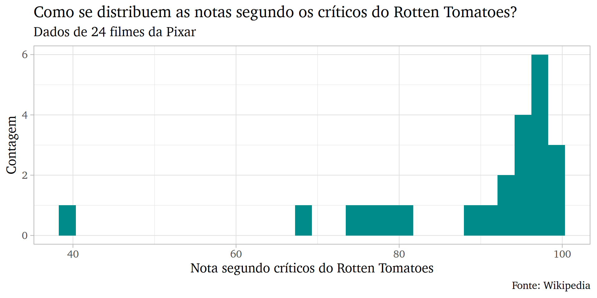 pixar_avalicao_publico |>ggplot() +aes(x = nota_rotten_tomatoes) +geom_histogram(fill ="cyan4") +labs(x ="Nota segundo críticos do Rotten Tomatoes",y ="Contagem",title ="Como se distribuem as notas segundo os críticos do Rotten Tomatoes?",subtitle ="Dados de 24 filmes da Pixar",caption ="Fonte: Wikipedia") +theme_light(base_size =16, base_family ="Charter")