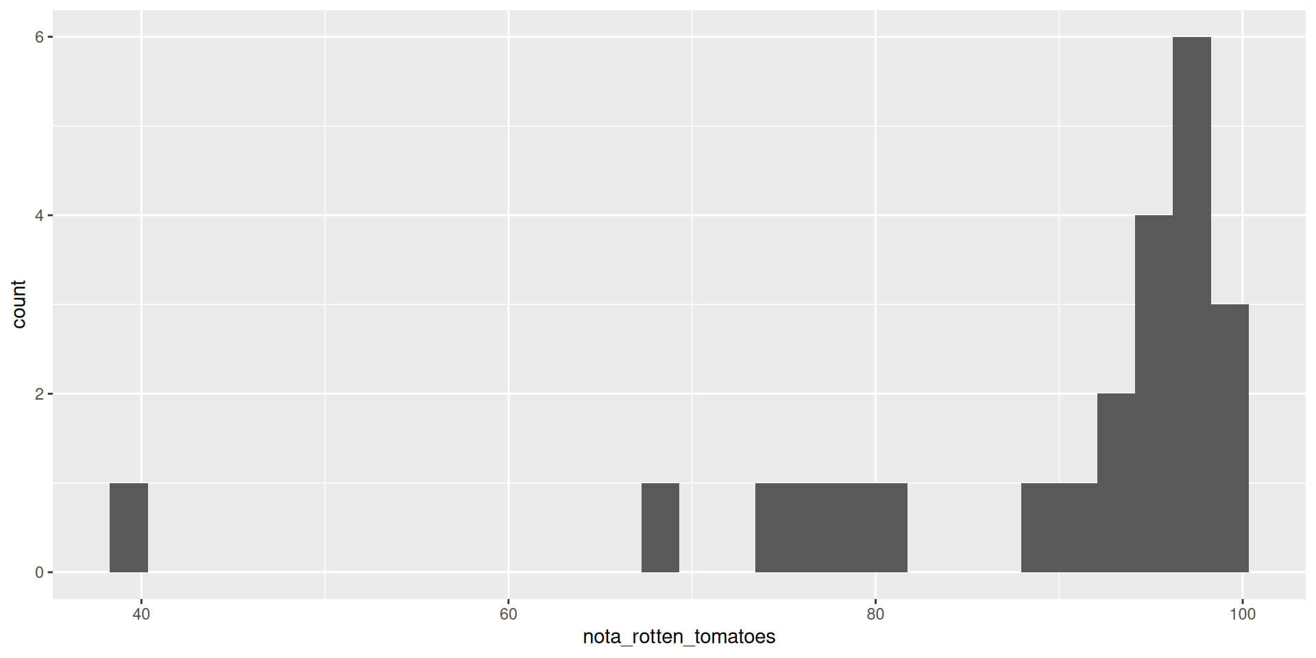 Na sequência, podemos observar um exemplo de histograma das notas dos filmes da Pixar no Rotten Tomatoes.