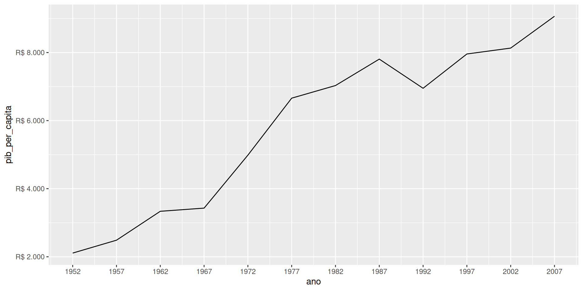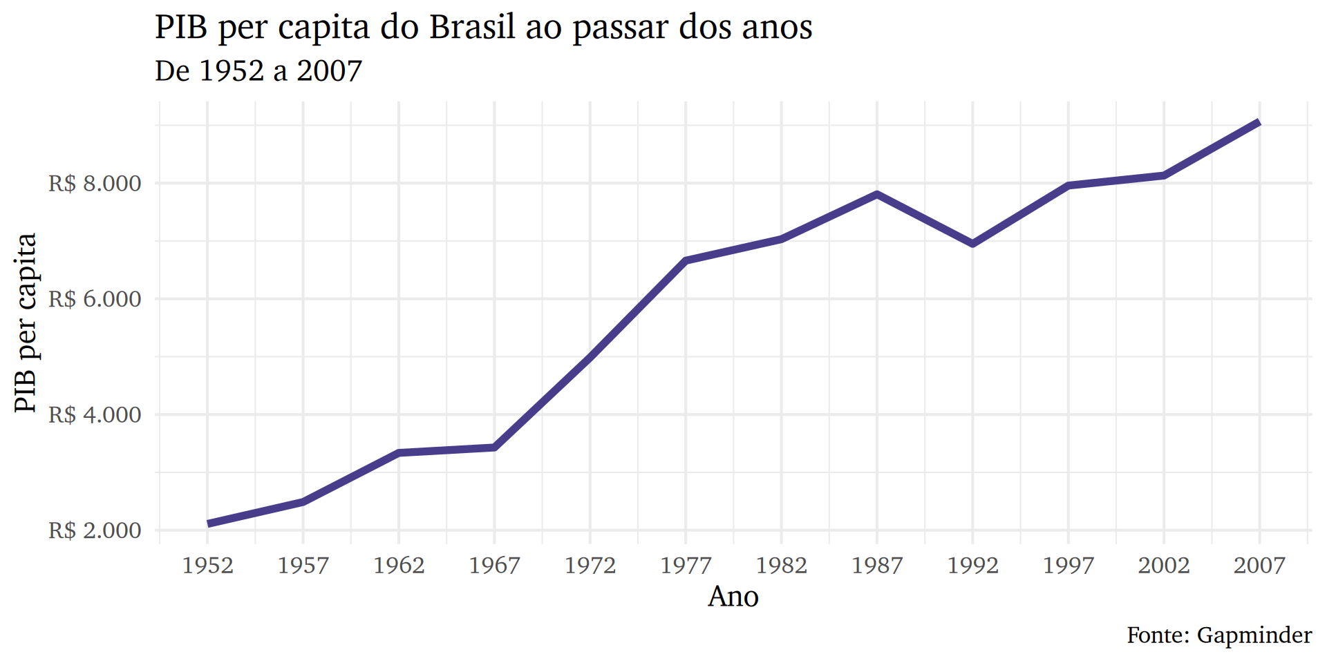 dados_gapminder |>filter(pais =="Brasil") |>ggplot() +aes(x = ano, y = pib_per_capita) +geom_line(linewidth =2, color ="darkslateblue") +scale_x_continuous(breaks =seq(1952, 2007, 5)) +scale_y_continuous(labels = scales::dollar_format(prefix ="R$ ",decimal.mark =",",big.mark =".")) +labs(x ="Ano", y ="PIB per capita",title ="PIB per capita do Brasil ao passar dos anos",subtitle ="De 1952 a 2007",caption ="Fonte: Gapminder") +theme_minimal(base_size =16, base_family ="Charter")